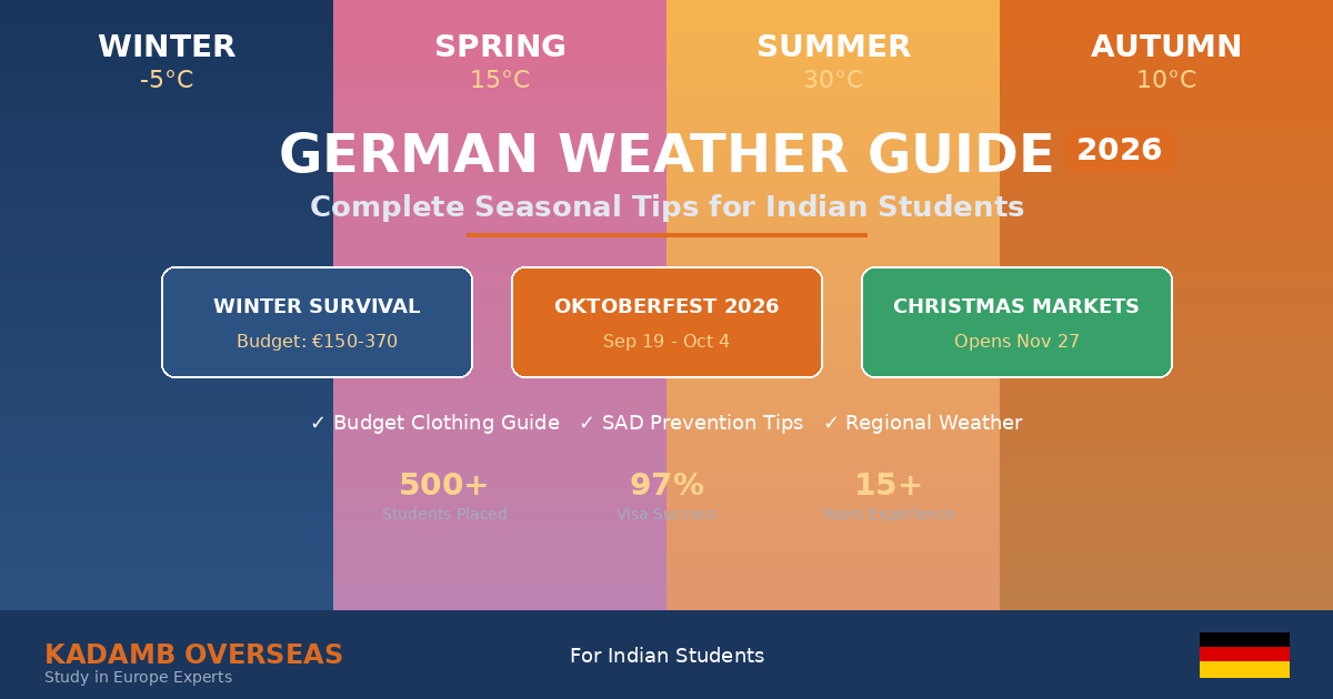 German winters can drop to -5°C with just 5 hours of daylight, while summers reach 30°C+ with 16+ hours of sunshine. For Indian students accustomed to tropical weather, adapting to Germany’s four distinct seasons is one of the biggest challenges—but also one of the most rewarding experiences. In this comprehensive 2026 guide, we’ll cover everything from building your winter wardrobe on a student budget to beating the “winter blues” and making the most of Germany’s spectacular seasonal festivals. Whether you’re arriving for the September 2026 intake or February 2027, this guide will prepare you for every season in Germany.