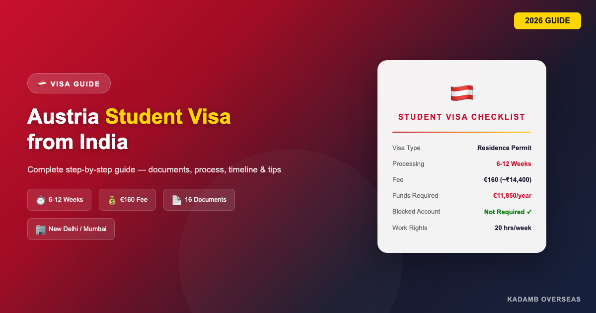The Austria student visa process from India requires applying for a Residence Permit for Students (Aufenthaltsbewilligung Studierende) at the Austrian Embassy in New Delhi, with a processing time of 6-12 weeks, a visa fee of approximately EUR 160, and financial proof of EUR 11,850 per year (students under 24) or EUR 13,000 per year (students 24 and above). Unlike Germany, Austria does not require a blocked account or APS verification, making the process significantly faster and more straightforward. Indian students must submit their application with apostilled documents, proof of university admission, health insurance, accommodation proof, and a Police Clearance Certificate. This comprehensive 2026 guide covers every document, every step, processing timelines, embassy details, common rejection reasons, post-arrival registration, residence permit renewal, part-time work rights, and the Red-White-Red Card pathway after graduation. Whether you are applying from Ahmedabad, Delhi, Mumbai, or any other Indian city, this guide by Kadamb Overseas covers everything you need to know.